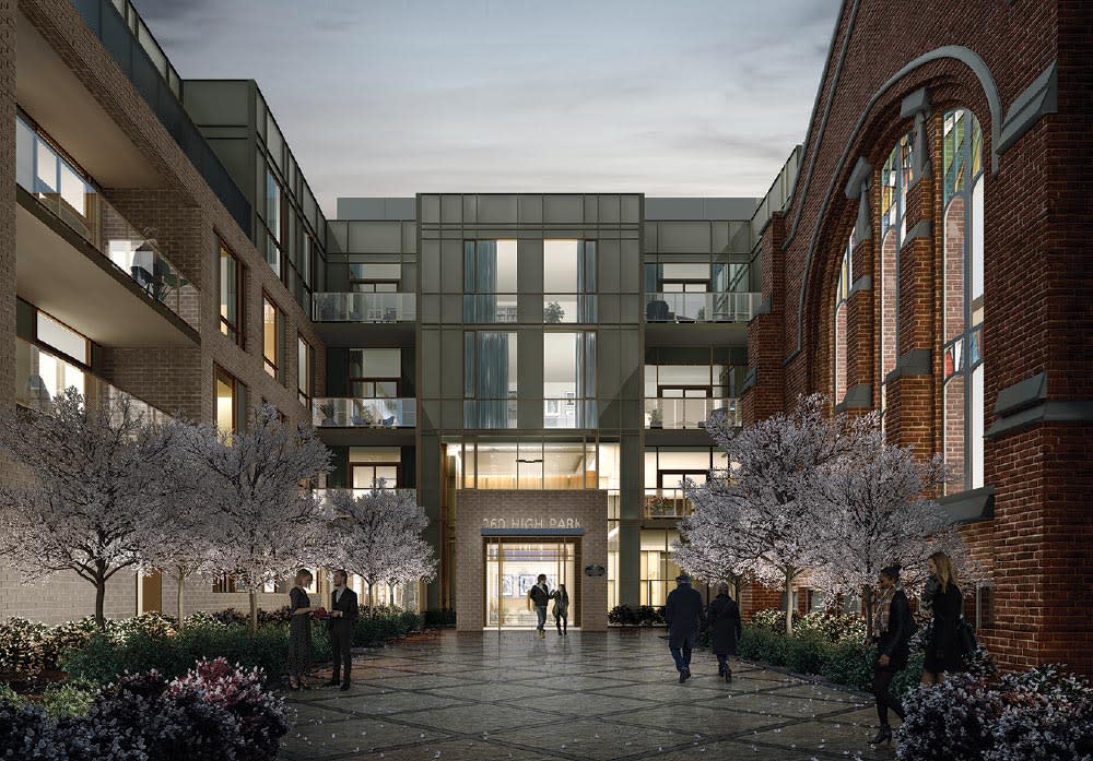 The High Park Alhambra Church, with its prominent architecture, has been a dynamic presence for over a century at the crossroads of High Park Avenue and Annette Street. Today, this repurposed landmark and its adjoining condominium immediately greets both residents and guests with an inviting courtyard setting.