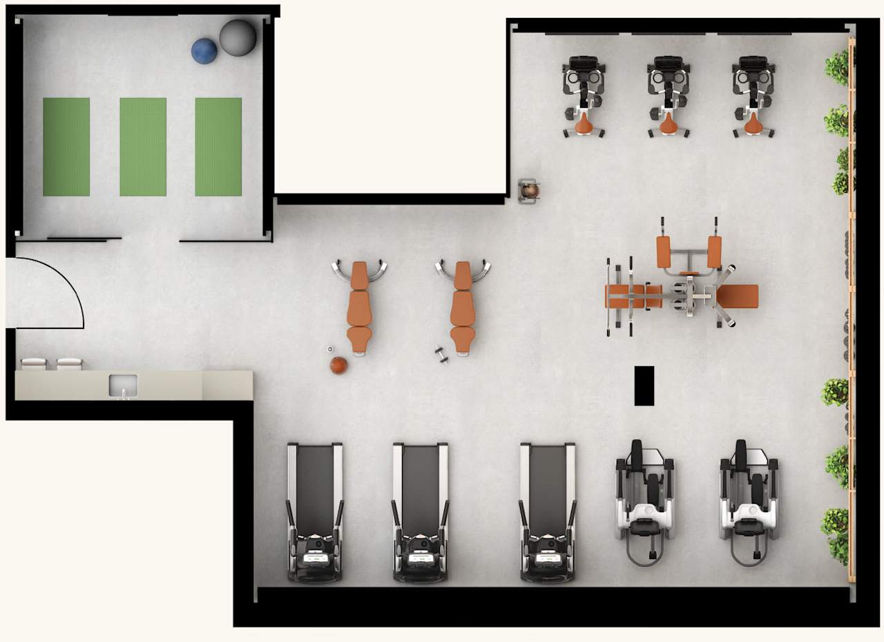 - Inhouse fitness space complete with cardio equipment, yoga studio, and strength training equipment